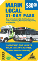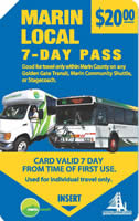 Marin Transit Passes (paper ticket) provide unlimited rides within Marin County for periods of 1 day and 31 days. Passes are non-refundable, non-transferable, not exchangeable, and they cannot be used for group travel. Passes may be used on any Marin Transit or Golden Gate Transit route, but only for travel entirely within Marin County. Visit Marintransit.org for more information.