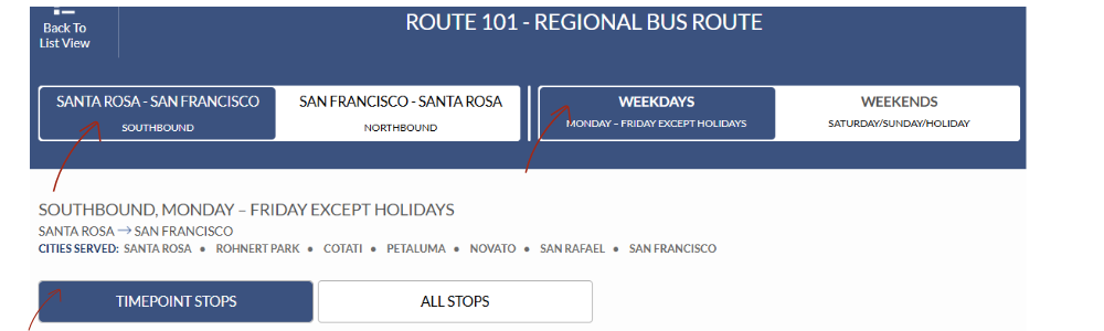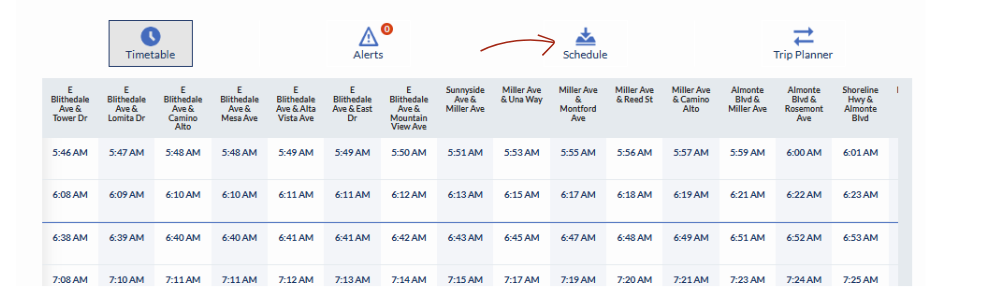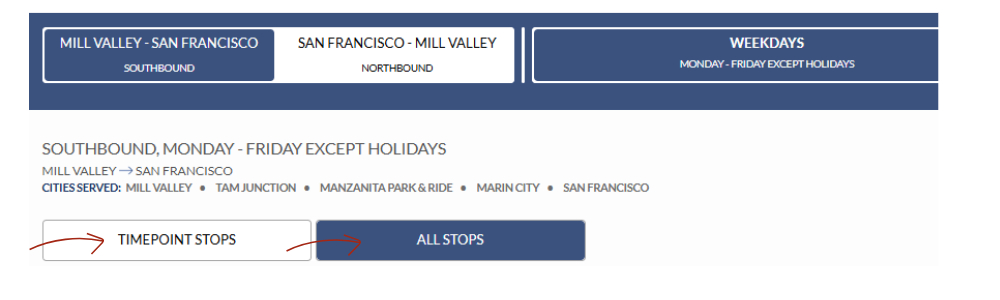 Our new online schedules now include a list of all stops the route serves instead of only listing timepoint stops. Select your desired direction and day of travel with the buttons at the top of the schedule page, then select “all stops” to view the entire list.