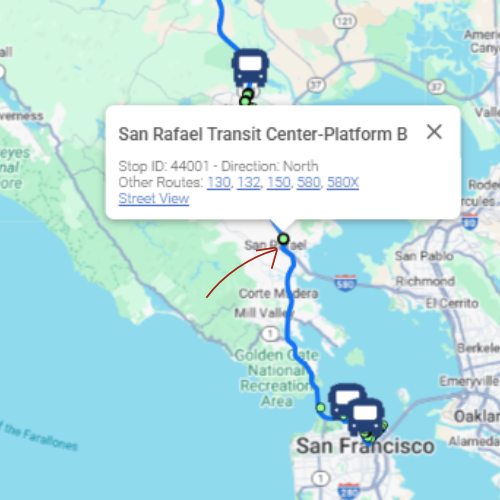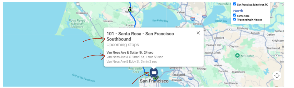 • Click on the bus traveling along the route map to see the direction it’s heading.