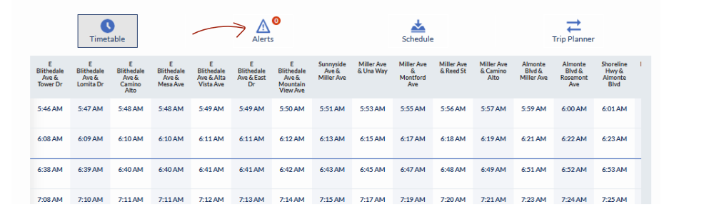 Click on the alerts icon from above your route timetable to see any active alerts.