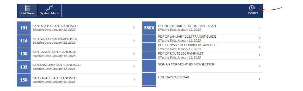 • Go to the list view of all bus routes and click on the “updates” icon on the right hand side of the blue bar.