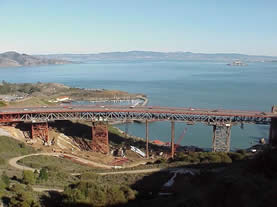 The maximum credible earthquake is predicted to create up to 12-inch displacements of the truss. To prevent the truss from crushing against the Marin (north) Abutment and Pylon N2, seismic expansion joints were constructed at these locations by removing a section of the orthotropic steel deck of the viaduct at Pylon N2 and removing and reconstructing the Marin Abutment backwall. These joints enable truss displacements of up to 15 inches, thereby preventing damage that could jeopardize the integrity of the structure.