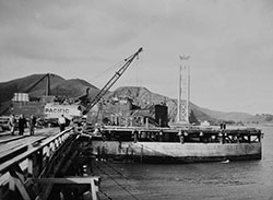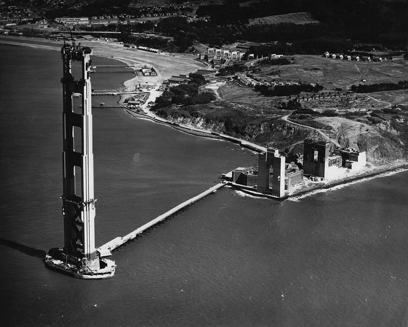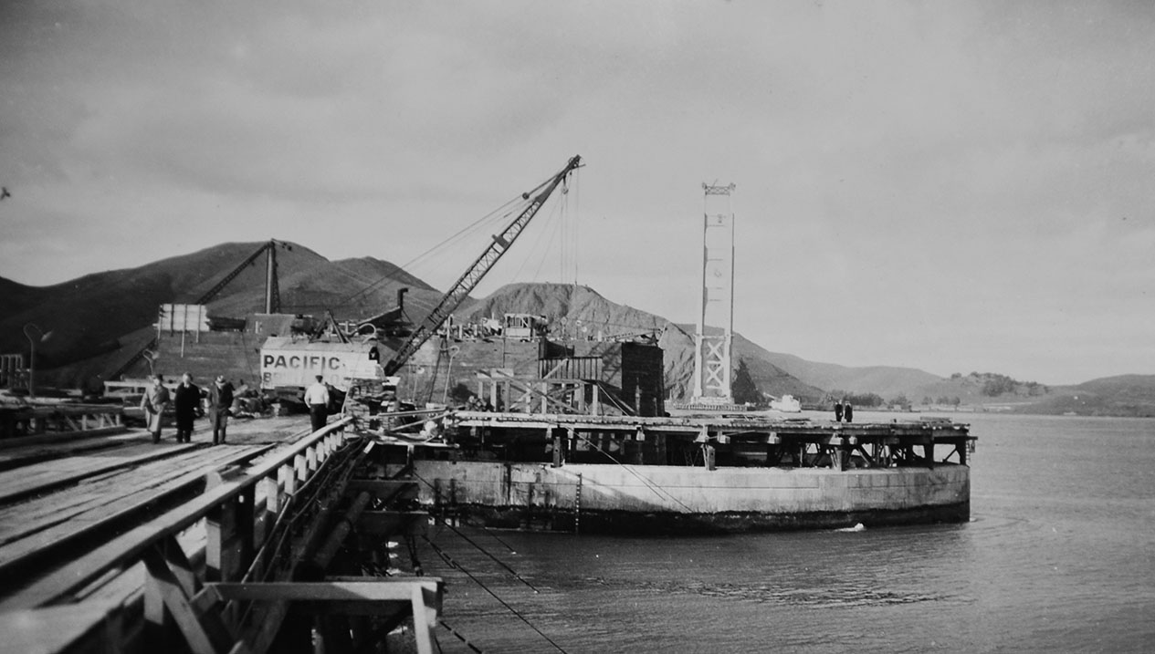 To reach the site of the south tower foundation, workers constructed a temporary roadway on a timber access trestle, or wharf, from the San Francisco shore. The dangers of the exposed location soon became apparent in 1933, when a freighter collided with the trestle. Two months later, over half of the repaired structure collapsed in a storm. Undaunted, the engineers and workers restored the structure and continued their work.