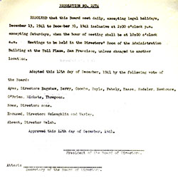 Resolution of the Board of Directors of the Golden Gate Bridge and Highway District to meet daily, following the December 7, 1941 attack on Pearl Harbor from the Golden Gate Bridge, Highway and Transportation District - The Board met December 12, five days after Pearl Harbor was attacked, and decided to meet daily during the rest of the month, excepting Saturdays. |