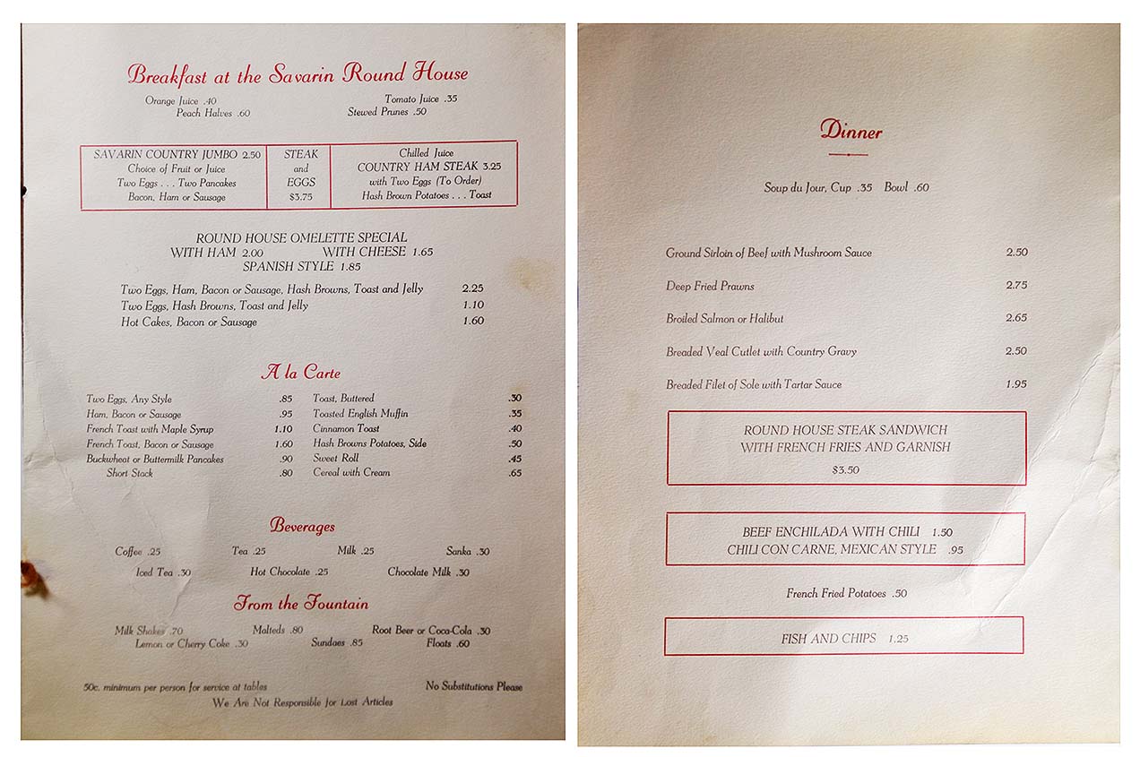 Menu from the Savarin Round House restaurant from the Golden Gate Bridge, Highway and Transportation District - The still-existing Round House was constructed in 1938, and the Savarin company operated it as a full-menu café. |