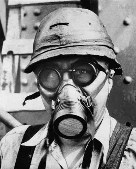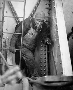 Safety was a priority. Workers wore helmets, special wind goggles, and headlamps for the dark, enclosed areas - a first in bridge construction. The undercoat of paint, the primer, contained lead to prevent the steel from rusting. Workers wore respirators to protect them from lead fumes released during the installation of red-hot rivets. Today, the paints used on the Bridge contain no lead.