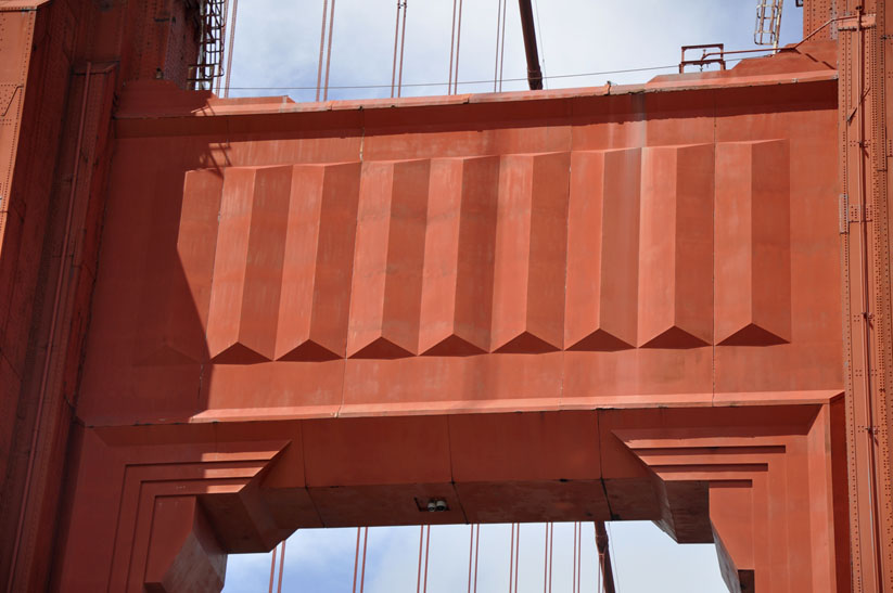 Named for the Exposition Internationale des Arts Décoratifs et Industriels Modernes, held in Paris in 1925, the Art Deco style was used by architect Irving Morrow to add aesthetic touches throughout the Bridge. These include chevron or beveled shapes and an expression of verticality.