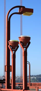 Lights that point down are street lights for Highway 101 traffic crossing the Bridge. The round lights pointing up emphasize the height of the towers at night, an up-lighting technique often used on Art Deco skyscrapers of the 1930s, such as the Empire State Building.