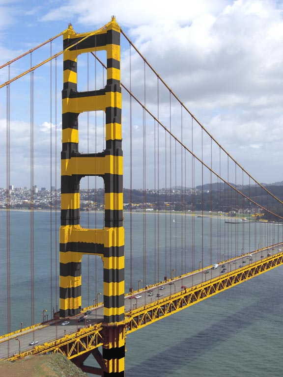 Besides International Orange, other color schemes were considered when the Bridge was built. One alternative that was proposed was a striped design to make it more visible to ships and airplanes.