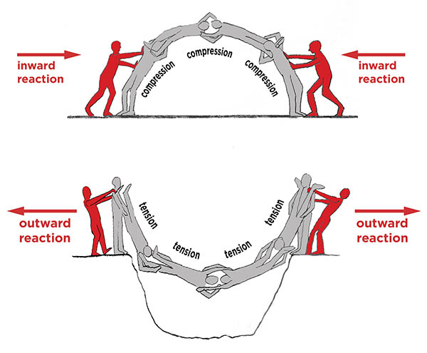 The curving cables of a suspension bridge are in tension, experiencing pulling forces. The opposite or upside down picture of those curves looks like an arch. The forces in the arch, compression forces, are the opposite of the tension forces that the suspension bridge cables experience.