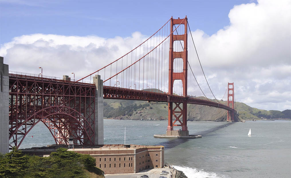 At the south (San Francisco) end of the suspension bridge, a large steel arch carries the roadway deck over Fort Point, the brick fort below.