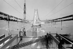 This promotional film, made by Bethlehem Steel, follows the steel elements of the Bridge from the steel fabrication factory in Bethlehem Pennsylvania through the Panama Canal and arrival in the San Francisco Bay Area. It provides original footage of the cellular construction of the towers, the riveting, and placement of the cable saddle, the construction of the deck, and the spinning of the cables. (26:35 minute video)