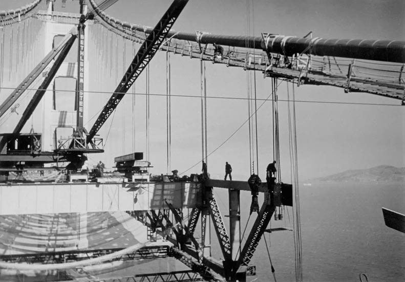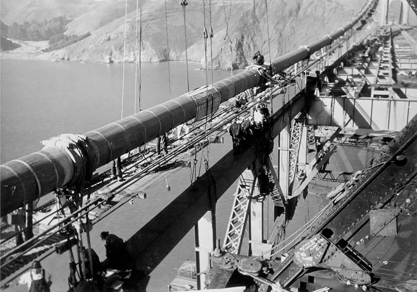 Looking north, toward the Marin County end of the Bridge. The suspender ropes are in place, ready for deck installation.
