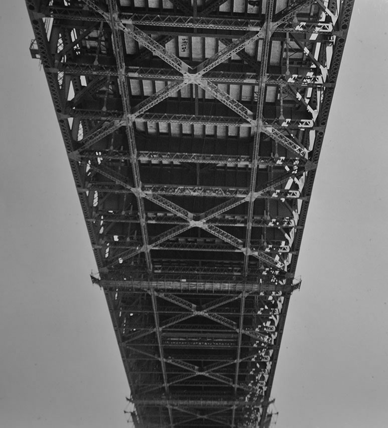 Photograph of the completed lower lateral deck bracing from the Golden Gate Bridge, Highway and Transportation District - A photograph from beneath the Bridge deck c. 1954 showing the diagonal bracing added across the underneath portion of the deck to stiffen its resistance to twisting in the wind. |