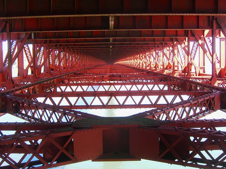 This is a scale model of a 500-foot (152-meter) length of the original deck structure of the Golden Gate Bridge, without the roadway on top. The trusses on the sides, along with the framing on top that supports the roadway, form an upside-down U-shape.