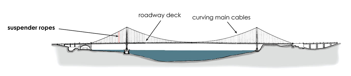 The roadway deck of the Golden Gate Bridge, and all the weight of the traffic on it, is hung from the curving main cables by steel suspender ropes.