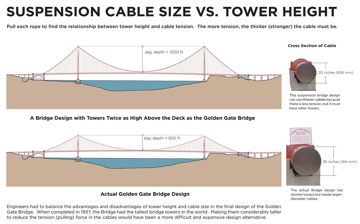 Engineers had to balance the advantages and disadvantages of tower height and cable size in the final design of the Bridge. Click image below for full size.