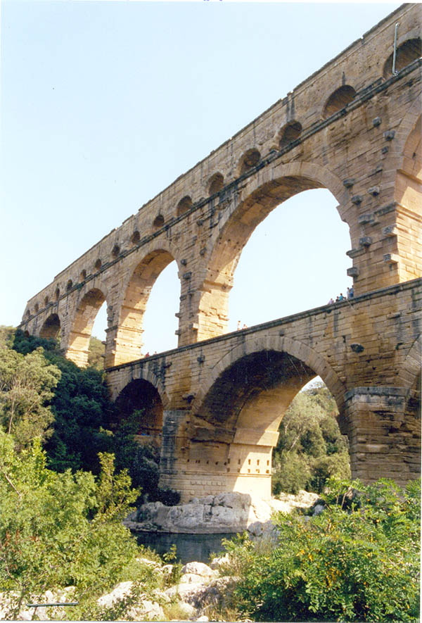 Arches were often used in ancient times to form bridges. Arches carry load primarily in compression (resisting pushing forces.) They can be made out of masonry (stones or bricks) because those materials are strong in compression. Each stone or brick pushes on its neighbor. Masonry is also durable, and most locations have a natural supply of stone that can be cut into shapes or clay that can be hardened with fire into bricks. The Romans built many arch bridges, such as the multi-level Pont du Gard that can be visited in France. That bridge served as an aqueduct to carry water over a river valley. Water ran in a trough at the top level of the bridge.