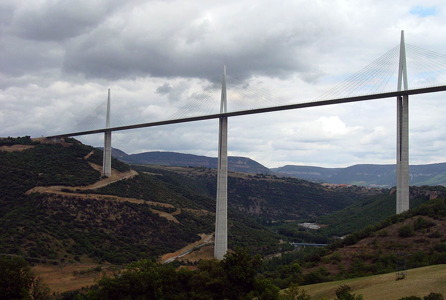 Cable-stayed bridges have straight cables extending from towers to hold up the roadway deck. As those cables (stays) pull up on the deck, they also pull toward the mast, and thus the roadway deck structure must be strong enough to resist a large compressive force. Crossing the Millau Viaduct in France, cars drive 1,132 ft (343 m) above the valley below.