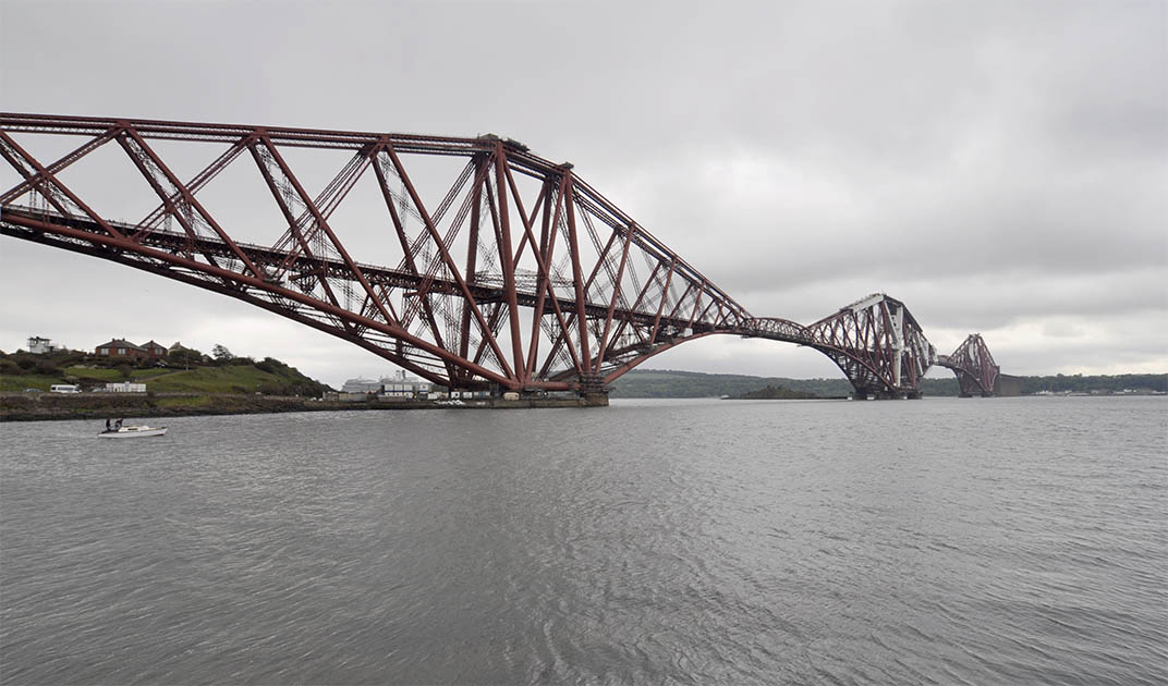 The straight members that make up a truss are struts or “sticks” of steel in modern bridges. The struts form triangles, which are inherently rigid. Truss bridges carry weight efficiently because each of their straight members is either pulled (in tension) or pushed (in compression). The tension or compression flows straight through the length of each member, without causing it to bend or flex. When the Firth of Forth Railroad Bridge was completed in Scotland in 1890, it was the longest-spanning bridge in the world (1,710 ft, 521 m) and one of the first to be made of steel rather than iron.
