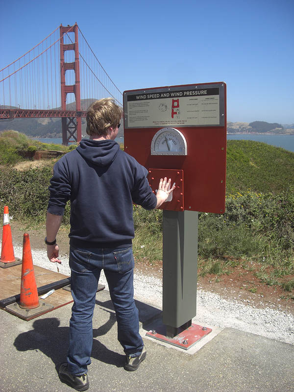 The Golden Gate is a very breezy place, the only gap in the coast range for hundreds of miles. Cool, dense, high pressure air over the cold ocean pushes its way into the Bay and California’s interior, while the land heats up and the air over it becomes warmer, less dense, and lower in pressure. This exhibit allows the visitor to feel how much harder it is to push with a force equivalent to a wind of various speeds.