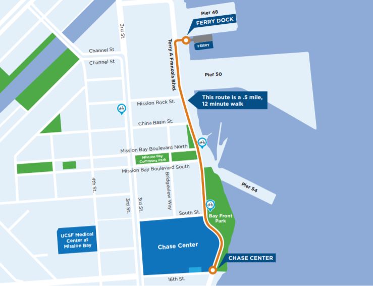 The Chase Center—San Francisco's newest sports and entertainment destination—is located at 1 Warriors Way in San Francisco. The ferry dock is located at Pier 48, about a 12-minute (.5-mile) flat walk from the arena.